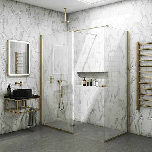Arezzo Square Brushed Brass Frameless 10mm Wetroom Screen with Wall Mounted Arm